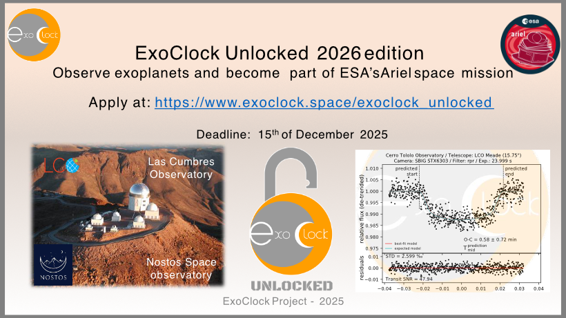 El equipo de ExoClock da la bienvenida a todas las personas interesadas en esta iniciativa interactiva: ¡una oportunidad única para descubrir la fascinante ciencia detrás de los exoplanetas! Las solicitudes están abiertas hasta el 15 de diciembre. El enlace para solicitudes y más información aquí: https://www.exoclock.space/exoclock_unlocked