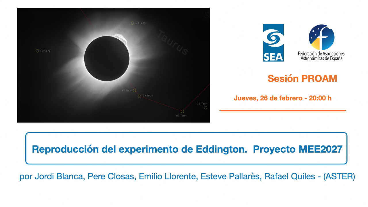 'Medición de la deflexión de la luz, en un eclipse total de sol' - proyecto renombrado MEE2027 : Modern Eddington Experiment 2027. Proyecto participativo abierto con el que se pretende reproducir la experiencia de las mediciones de la deflexión de la luz realizadas por Eddington durante el eclipse de 1919, en este caso aprovechando los dos eclipses que tendremos en España en 2026 y 2027.